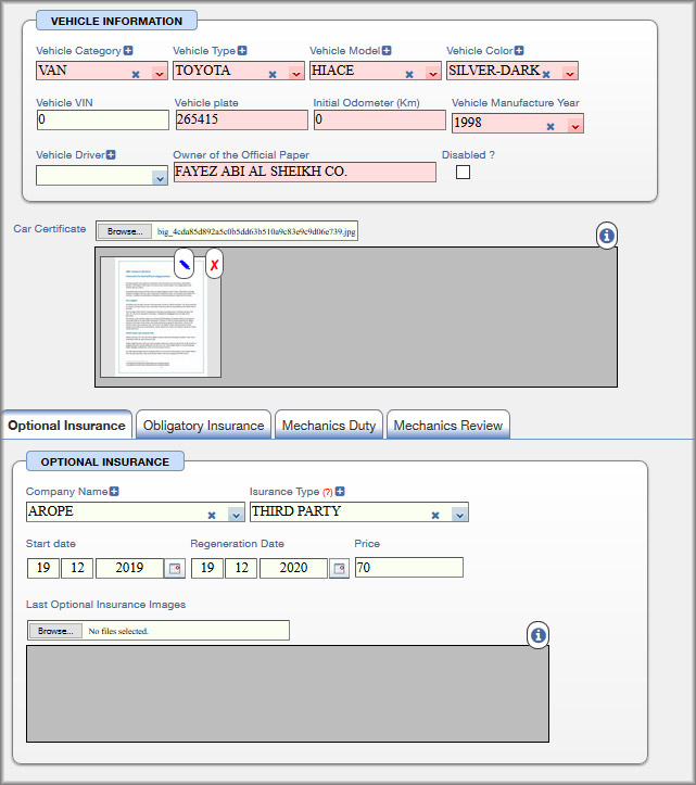 يتيح نظام إدارة أسطول السيارات تنظيم معلومات المركبات ومتابعة واحتساب مصاريف السيارات من حيث التامين والمعاينة الميكانيكية ورسوم الميكانيك والصيانة ومعلومات السيارة والسائق.....
